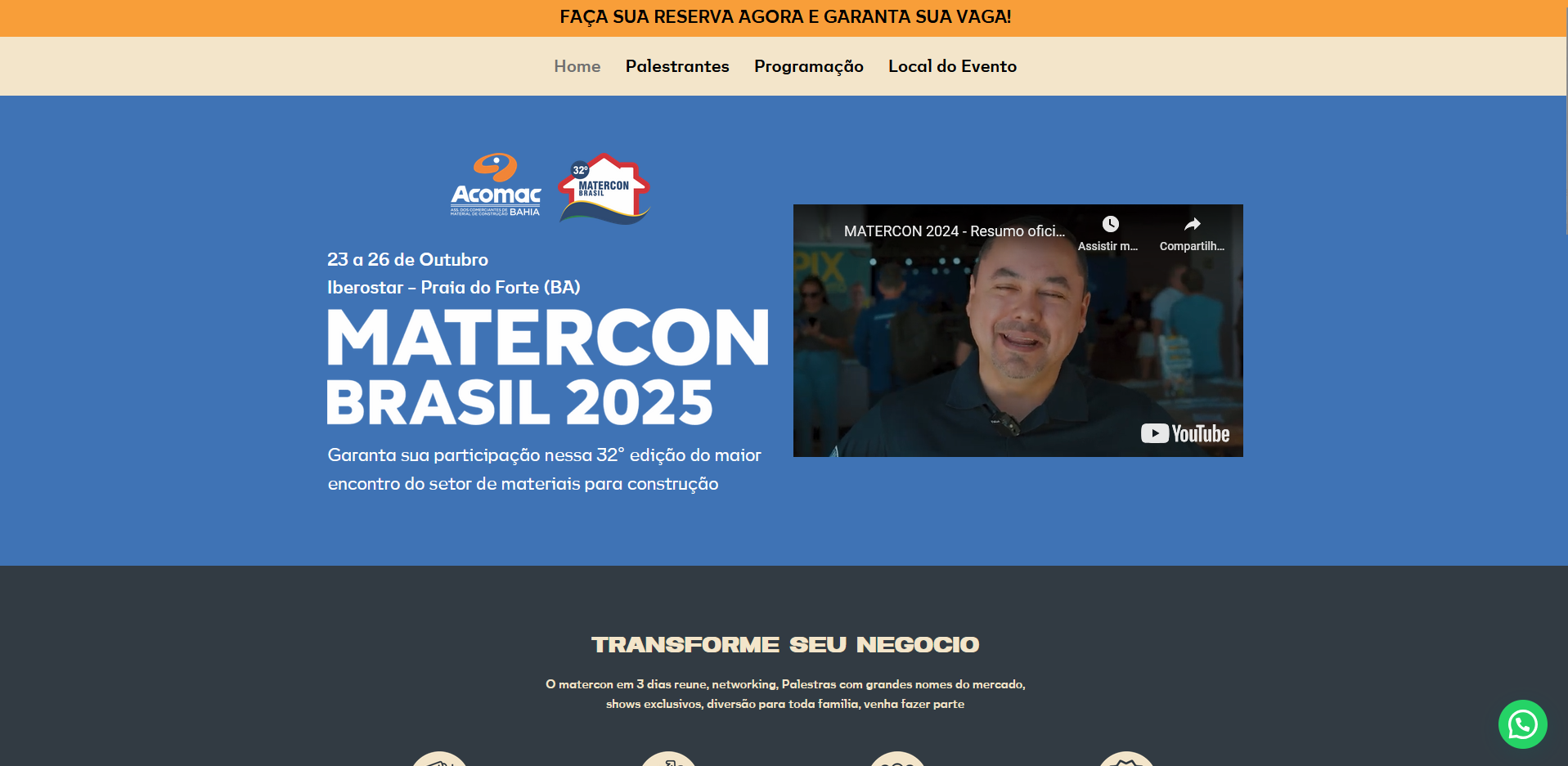 Orgulhosos de apresentar o site desenvolvido para o Matercon Brasil 2024! Uma plataforma moderna e intuitiva, projetada para proporcionar uma experiência única aos participantes e facilitar o acesso a todas as informações do evento.